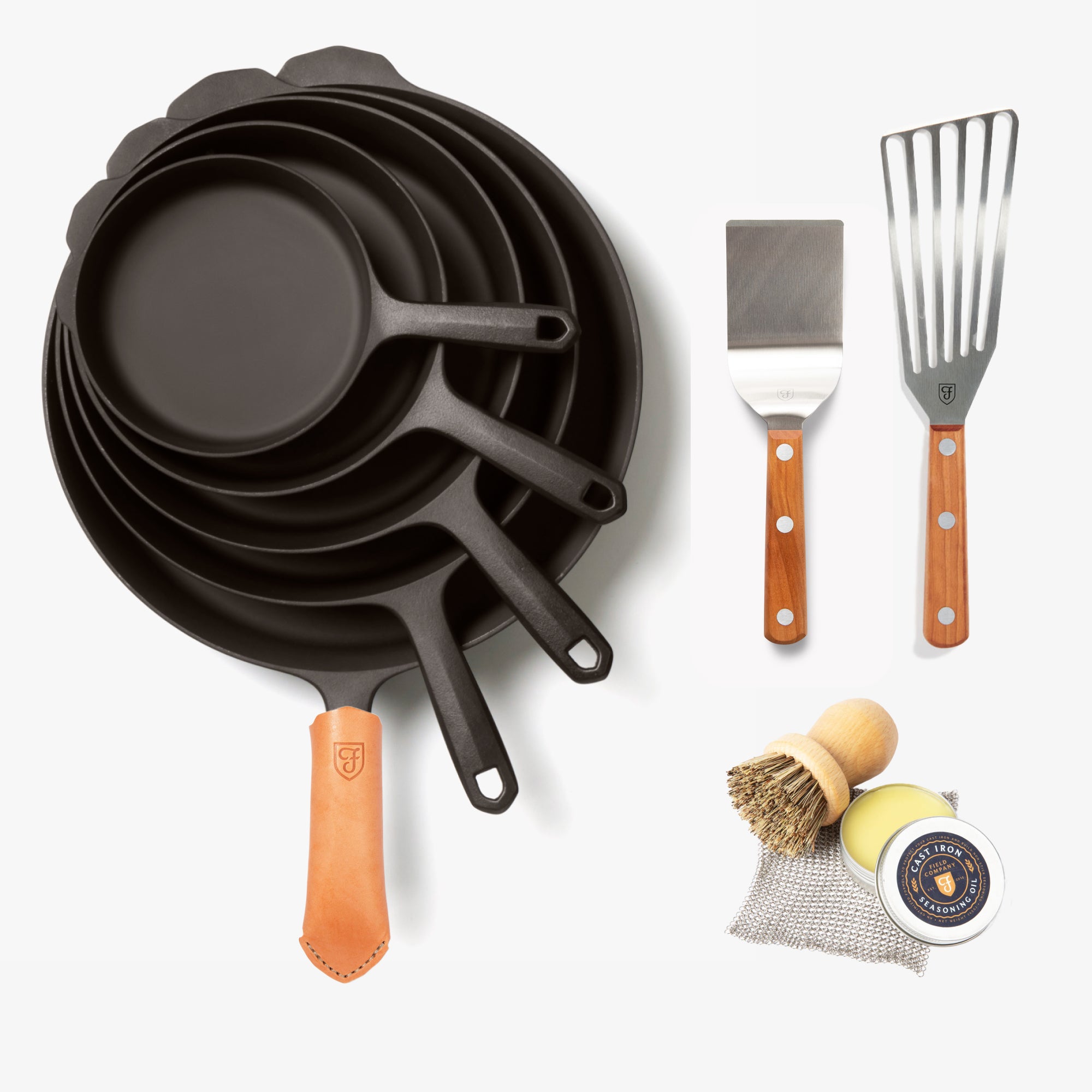 Host anything and cook everything with five skillets, a leather handle cover, two turners and a care kit. Our full range of lighter, smoother, American made cast iron.